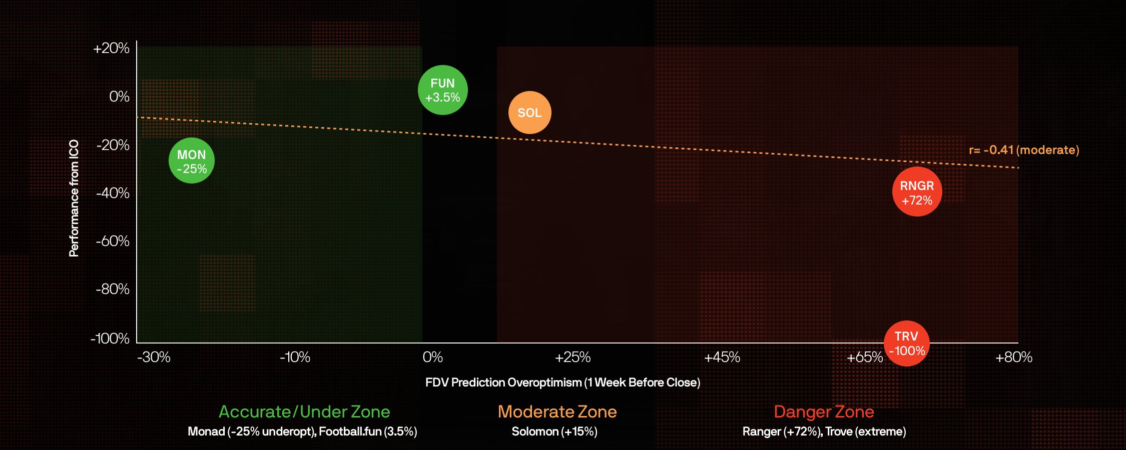 数据显示,过度乐观程度与ICO回报率之间存在中度负相关(r=-0.41)。Monad被市场“低估/悲观”(-25%),但其价格较ICO仍下跌了24%。Ranger是被“过度乐观”最严重的(+72%),目前较ICO价格已下跌32%。只有Football.fun仍维持在ICO价格之上(+1%)。