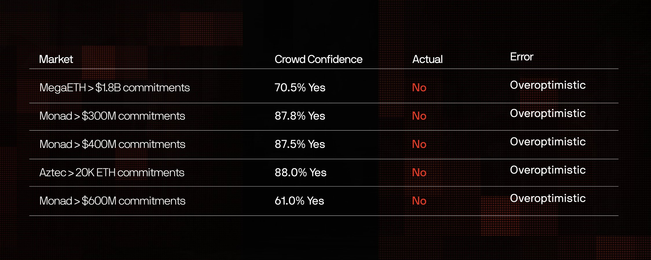 我们复盘了每一个“大众信心超过60%但最终未能实现”的预测市场。在每一个案例中,错误的方向都是一致的:过度乐观。大众始终认为融资额会比实际更高,估值会比现实更贵。