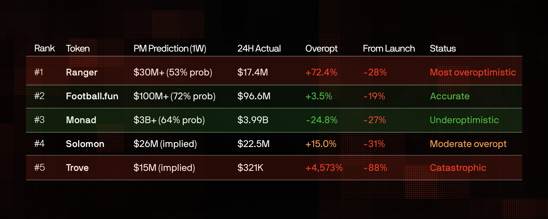 4. 保守预测=更好的结果。预测相对准确的代币(Monad、Football.fun)跌幅较小。低炒作热度和准确的预测似乎是看涨信号。