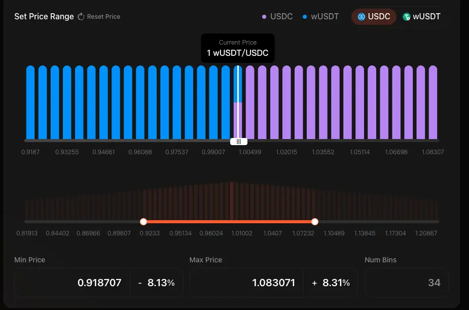 Magma 的 ALMM(自适应流动性做市商) 是对传统 AMM 与 CLMM 的进一步进化,通过 基于价格档位(Bin)的流动性结构 ,在固定价格点上集中流动性,形成类似订单簿的阶梯式曲线。相比 CLMM 的区间管理: