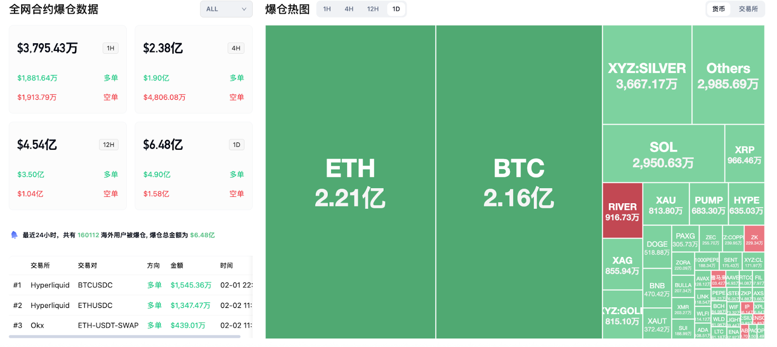 24小时爆仓数据:全球共160112人被爆仓爆仓总金额为6.48亿美元,其BTC爆仓2.16亿美元、ETH爆仓2.21亿美元、SOL爆仓2950万美元