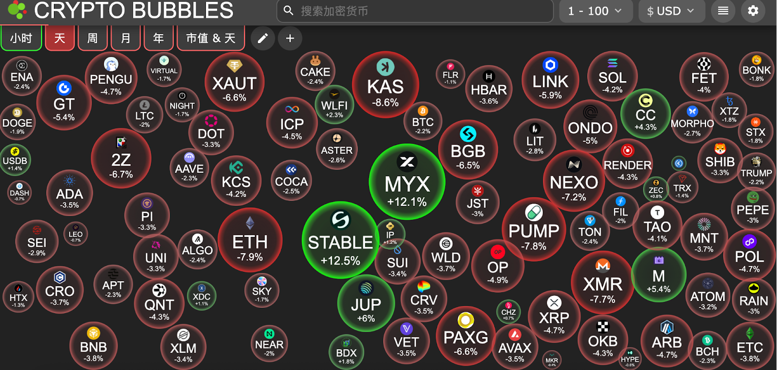 今日市值前100币种最大涨幅:Stable 涨 12.5%、MYX Finance 涨 12.1%、Jupiter 涨 6%、MemeCore 涨 5.4%、Canton Network 涨 4.3%。