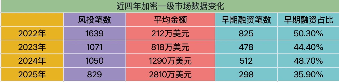 直接来数据,最近的一个四年周期内(2022 -2025),排除掉并购、IPO、公开募资等特殊一级市场活动, 加密行业的融资笔数呈现出明显的下降态势(1639 ➡️ 1071 ➡️1050➡️829)。