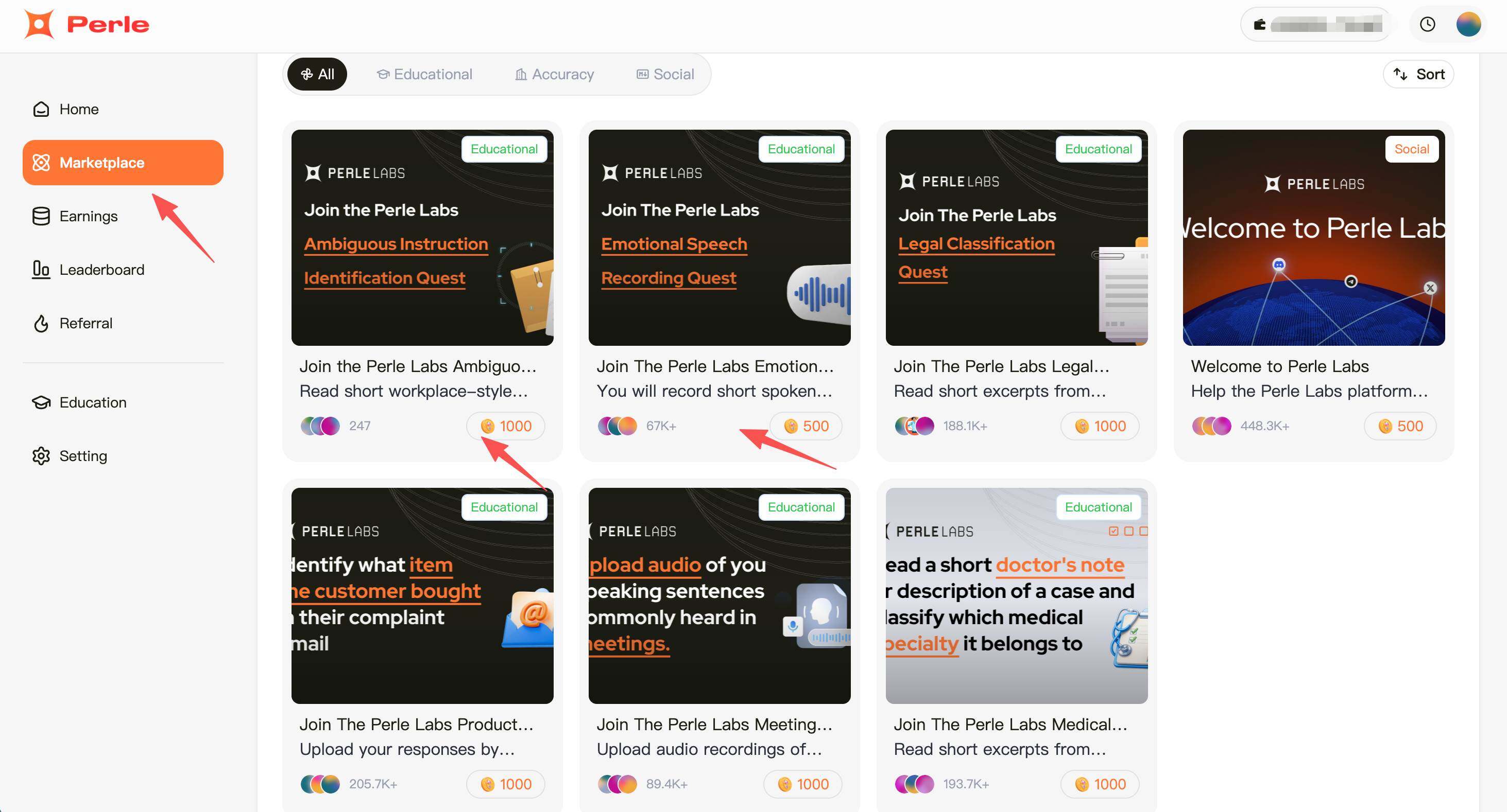STEP 2. 点击“Marketplace”,更新了 2 个任务,分别为 Join The Perle Labs Emotional Speech Recording Quest:带有特定感情地朗读指定内容(英文),共 5 题,每题 100 分,共 500 分、Join the Perle Labs Ambiguous Instruction Identification Quest:找出段落中表述模糊的语句,共 10 题,每题 100 分,共 1000 分。
