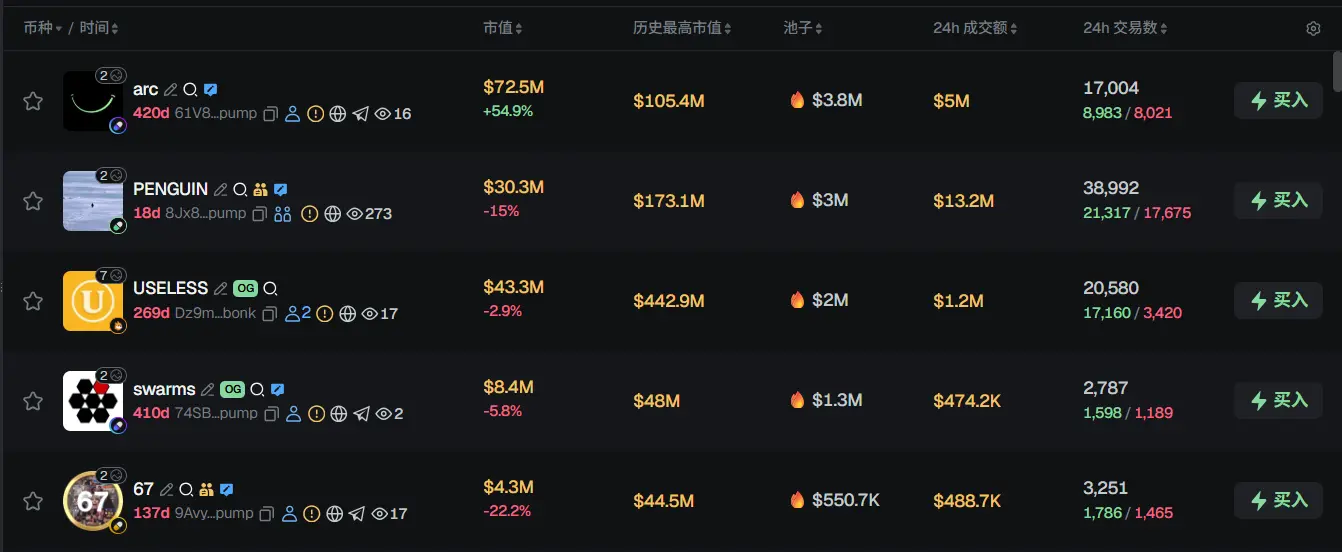 过去 24h Solana 热门代币前五依次为:arc、PENGUIN、USELESS、swarms、67