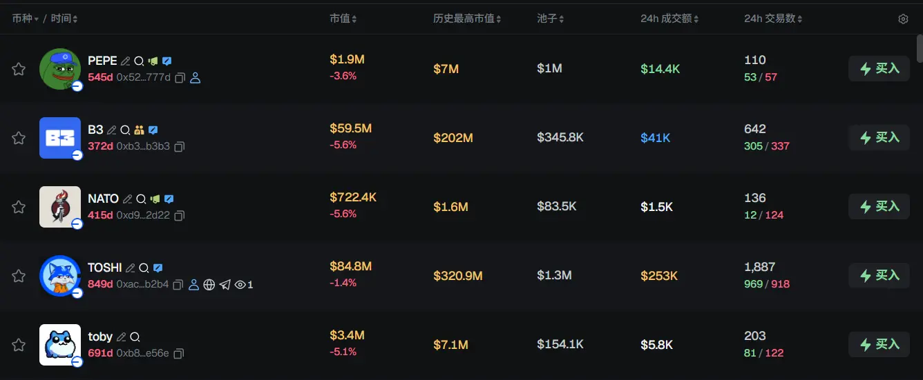 过去 24h Base 热门代币前五依次为:PEPE、B3、NATO、TOSHI、toby