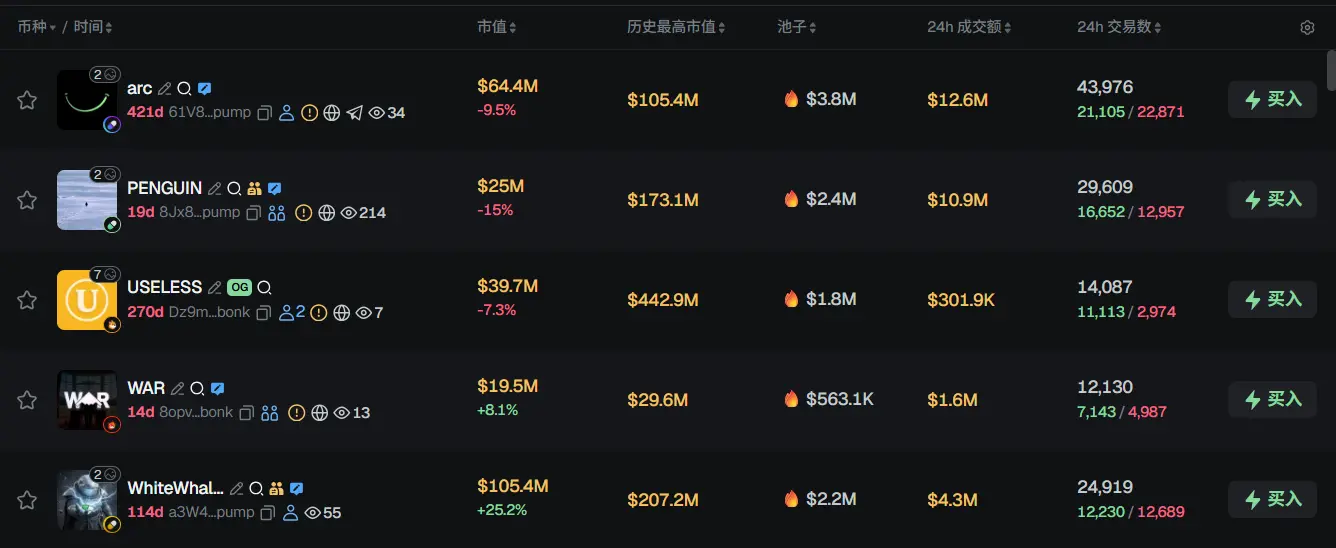 过去 24h Solana 热门代币前五依次为:arc、PENGUIN、USELESS、WAR、WhiteWhale