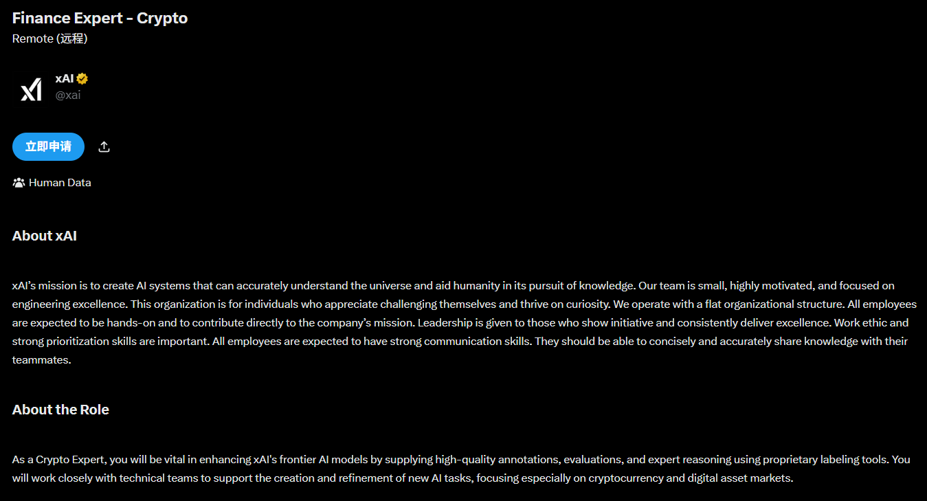該職位名稱為「Finance Expert – Crypto(加密貨幣財務專家)」,屬於 2026 年 2 月初新公布的招聘公告,顯示 xAI 正持續擴大其在加密資產與數位金融領域的布局,並嘗試將相關專業知識納入其前沿 AI 模型的訓練體系中。