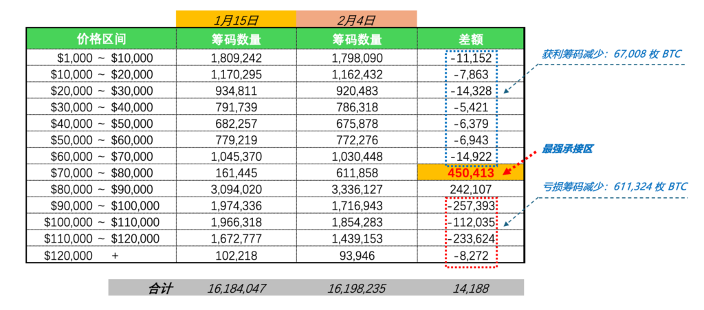 如圖 1 所示,從 1/15-2/4 期間,下方獲利籌碼合計減少 67,008 枚 BTC ,占總減少量的 9.7%;而上方虧損籌碼減少了 611,324 枚 BTC ,占總減少量的 88%;
