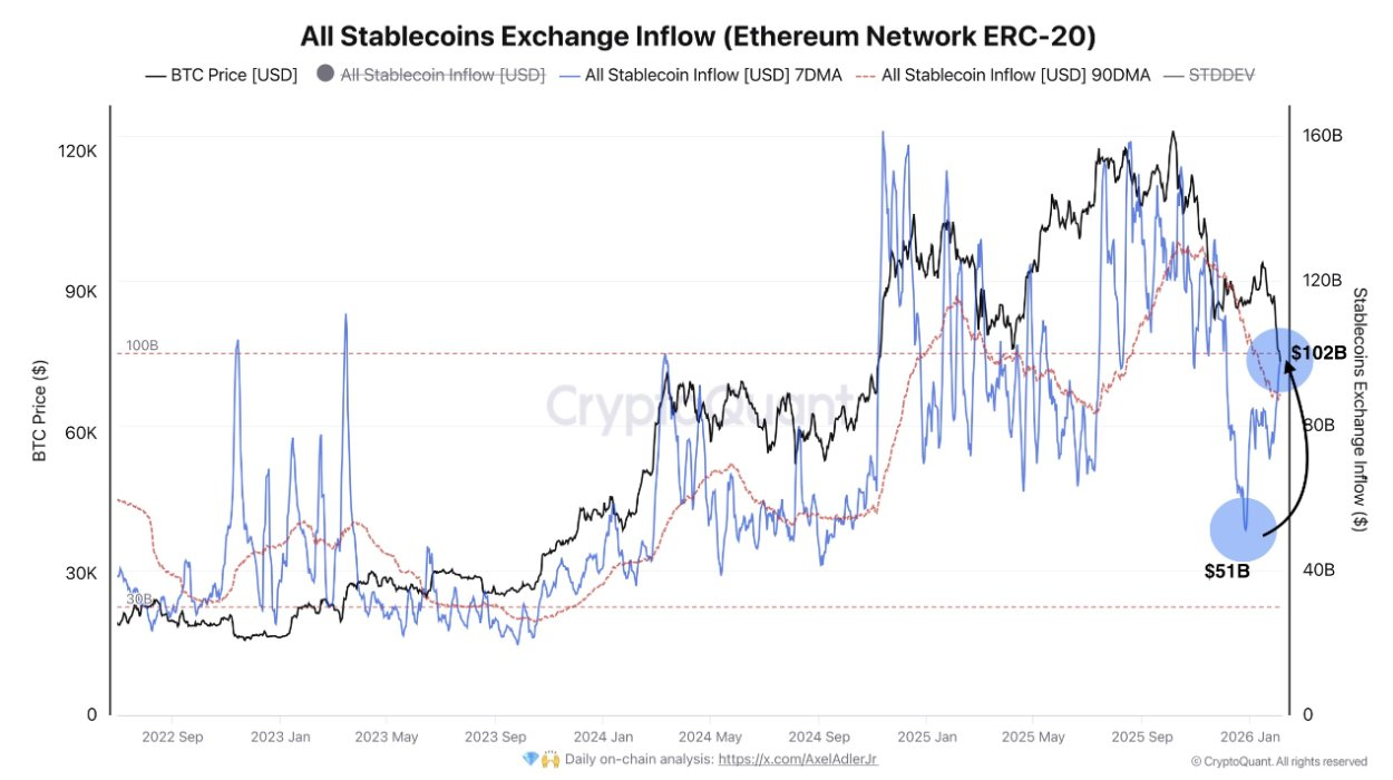 CryptoQuant分析师:尽管抛压持续存在,但稳定币流入交易所翻倍至980亿美元