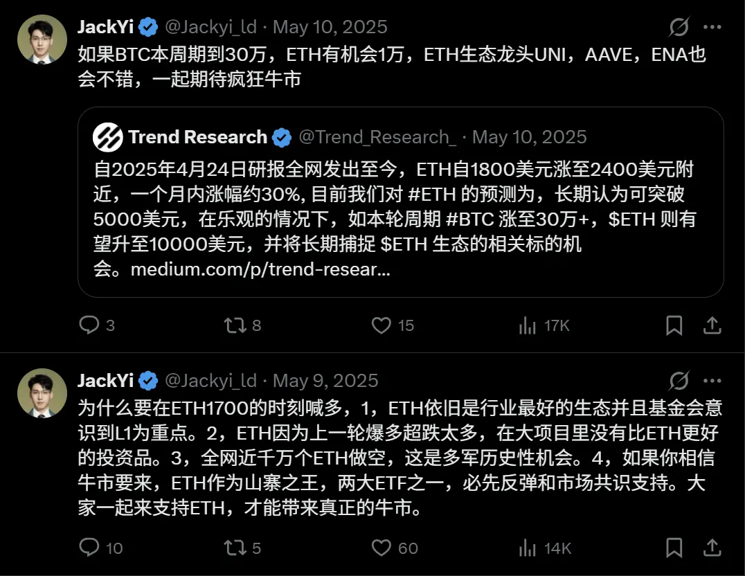“我们在ETH跌到1000多刀的时刻,看破主力清洗以太OG多军的意图而抄底成功,在ETH涨至4500多的时刻,看破大盘上涨至震荡顶而清仓成功。Trend Research在2025年有成功的抄底~逃顶业绩证明,我们不会因为情绪而改变投资策略。”易理华在 1 月仍然在为市场鼓气。