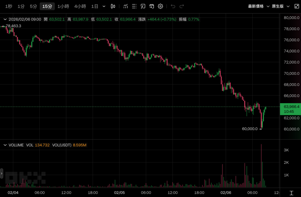 加 密貨幣市場遭遇了慘烈的單日暴跌。比特幣價格在短短 24 小時內從約 73,000 美元接連下挫,今晨八點多最低觸及 60,000 美元,單日跌幅高達 18%,截稿前反彈至 63,966 美元。以太坊也一度失守 1800 美元,最低插針 1,745 美元。