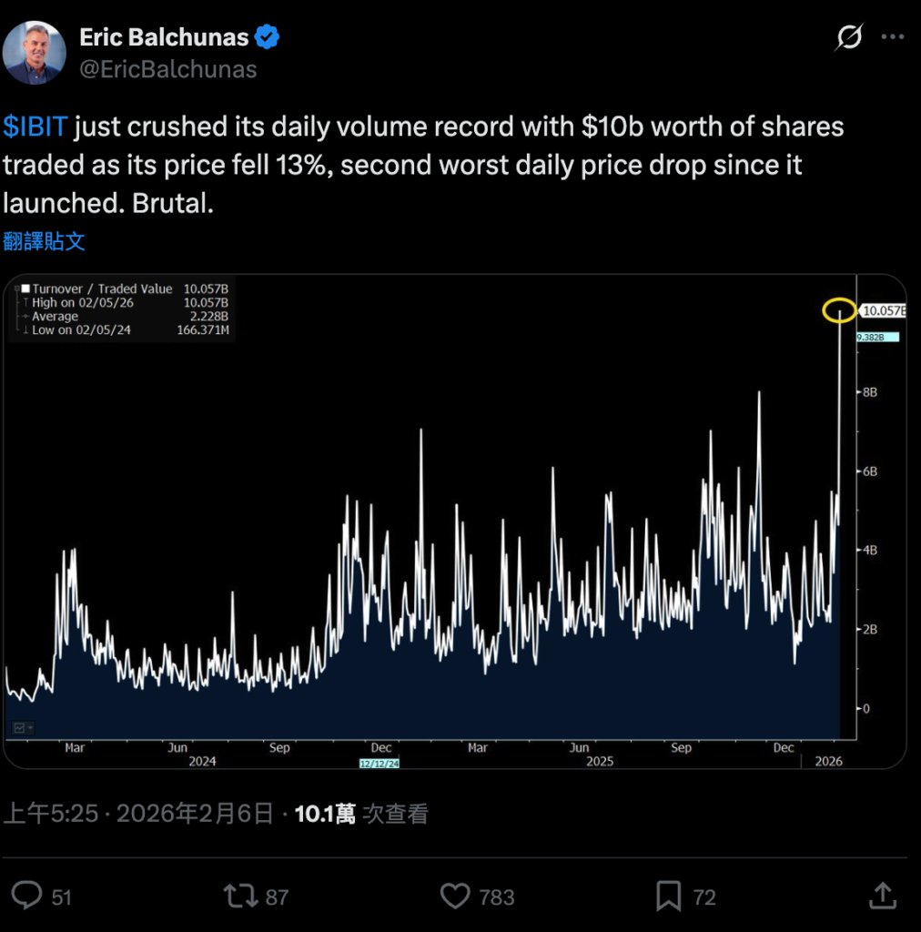 Bloomberg ETF 分析師 Eric Balchunas 表示 ,IBIT「徹底打破了單日交易量紀錄」,但他也指出,天量成交往往伴隨著極端恐懼情緒,代表大量投資者在同一時間選擇出逃。
