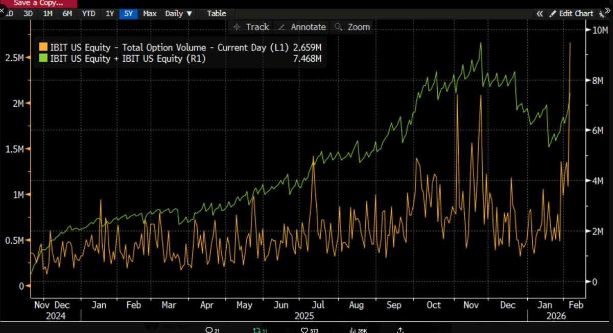 随着时间推移、更多数据陆续披露,情况正变得越来越清晰:这场剧烈的抛售,很可能与 比特币 ETF 有关,而当日本身也是资本市场近年来最为剧烈的交易日之一。我们之所以能够得出这一判断,是因为 IBIT 当天的成交量创下历史新高——成交额超过 100 亿美元 ,是此前最高纪录的 两倍 (确实是一个惊人的数字),同时期权成交量也刷新了纪录(见下方图表,为该 ETF 自上线以来的最高合约数量)。相较以往略显反常的是,从成交量结构来看,这一次 期权交易明显由看跌期权主导,而非看涨期权 (关于这一点,后文还会进一步展开)。