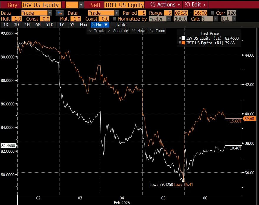 第一,比特币的这轮抛售,很可能 触及了某类并非纯加密原生的多资产投资组合或策略 。这既可能是前文提到的多策略对冲基金,也可能是类似贝莱德的模型投资组合业务那样,在 IBIT 与 IGV(软件类 ETF)之间进行配置,并在剧烈波动下被迫进行自动再平衡的资金。