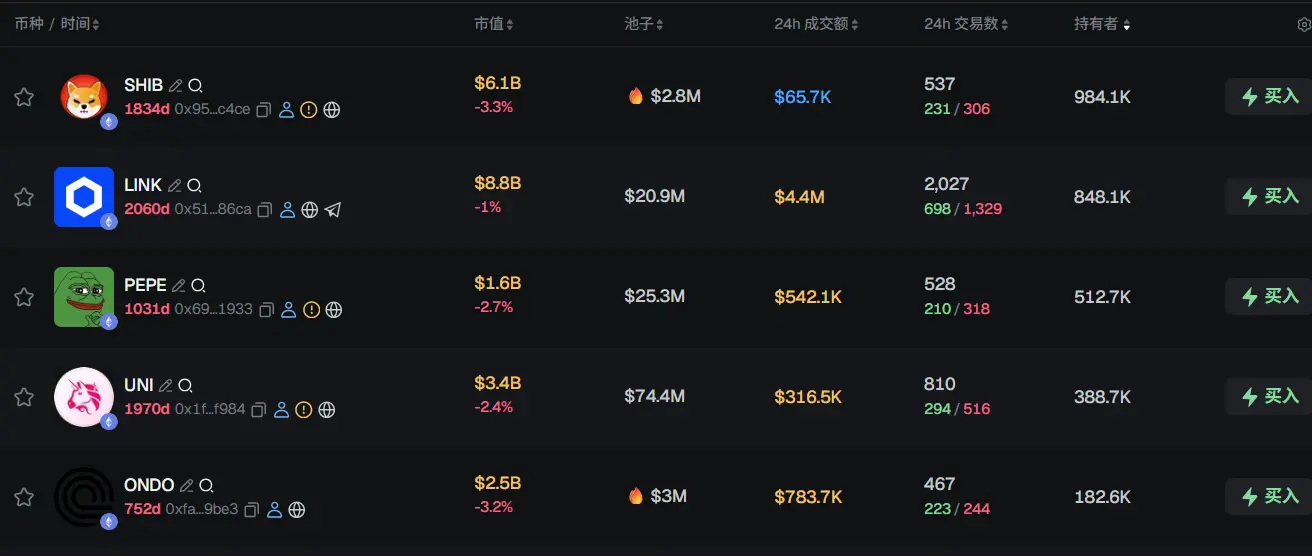 过去 24h ETH 热门代币前五依次为:SHIBLINKPEPE、UNI、ONDO