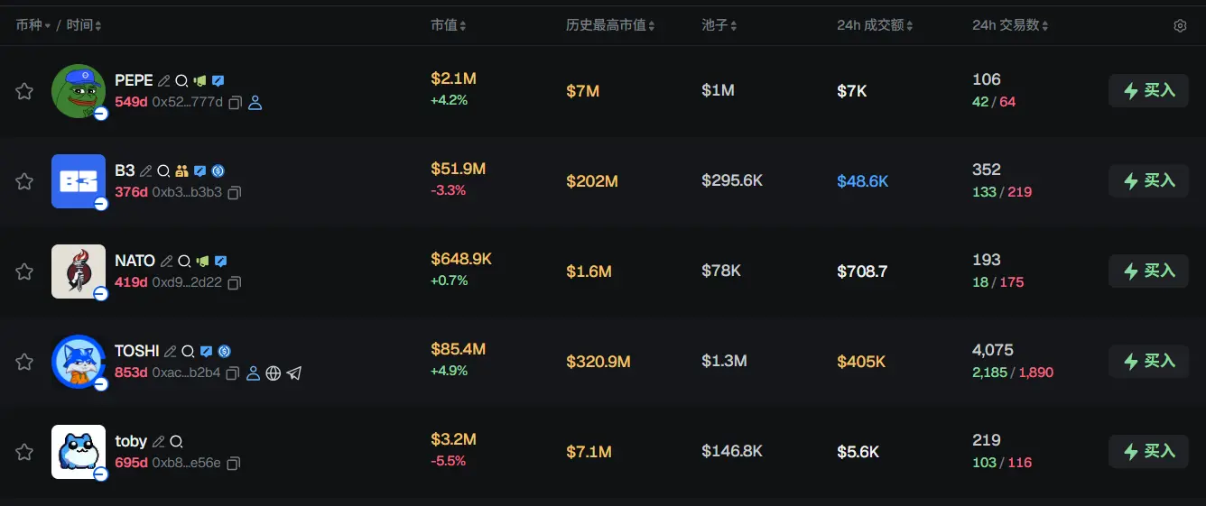 过去 24h Base 热门代币前五依次为:PEPE、B3、NATO、TOSHI、toby