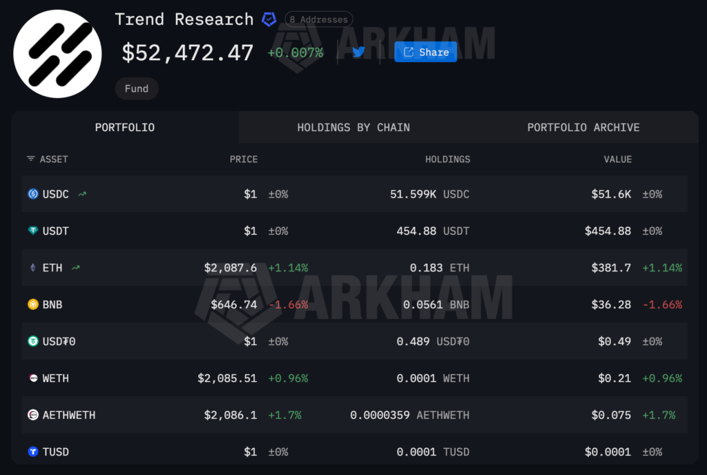 上分析平台 Arkham 今晨 捕捉到 :易理華旗下 Trend Research 已將最後約 534 枚 ETH 轉入幣安,價值約 111 萬美元。這筆交易完成後,這個曾經持有超 65 萬枚以太坊、倉位規模達 20 億美元的地址,當前餘額僅剩 0.18 枚 ETH。
