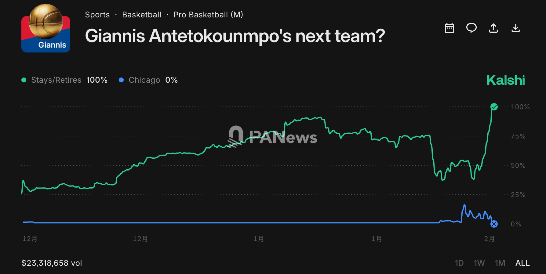 同一时间,预测市场Kalshi平台上围绕“字母哥去留”的事件合约,也开始进入结算阶段。该合约累计交易量超过 2330 万美元,是除了“NBA总冠军归属”外,成交额最高的NBA单一事件合约。