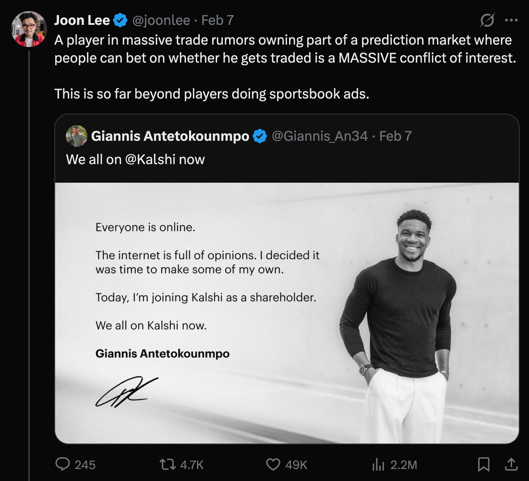 当人们以为交易截止日已过,字母哥的系列闹剧终于可以完全收场时。字母哥紧接着就出人意料地“将天赋带去Kalshi”,摇身一变成为了该平台的股东。长期凭交易流言获得高曝光,最终在万众瞩目下签约商业合作。这种行为,引发了许多球迷的不满。