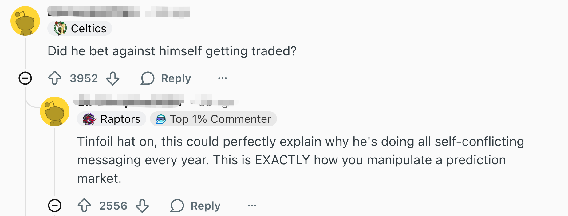 在合作声明中,Kalshi强调字母哥将被禁止参与任何与NBA相关的交易。但真正的风险仍然存在,对于字母哥自我监管的意愿、能力、力度和信息透明度,球迷也并不看好。甚至有不少球迷开始阴谋论,字母哥本人是否也参与了关于他去留的交易。结合在NBA交易截止日之前,字母的反复表态存在矛盾的情况,有人推测他是在操纵内幕交易,顺带戏耍球迷。