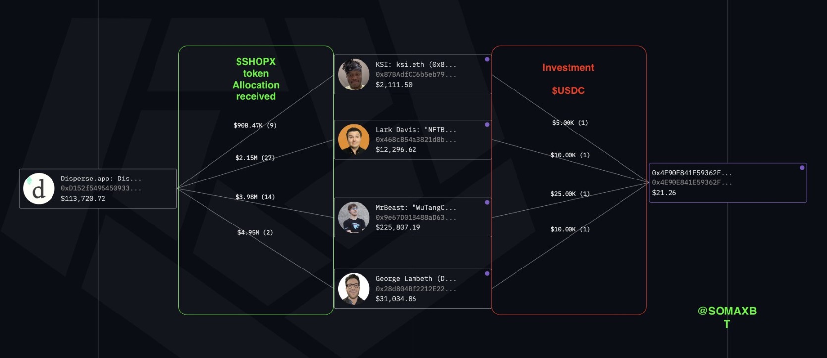 据 SomaXBT 称,MrBeast 向该项目投资了 10 万美元,并获得了 100 万个 SUPER 代币作为回报。在他投资之后,代币价格飙升,MrBeast 于 2021 年 3 月 30 日将其 SUPER 代币转移到一个备用钱包,在那里,这些代币被通过一系列交易抛售,总计 1,900 ETH(当时约合 370 万美元)。MrBeast 根据一份归属合同获得了额外的 SUPER 代币,随后他又以 550 万美元的价格将其出售,使他从该项目中获得的总收入达到约 900 万美元。