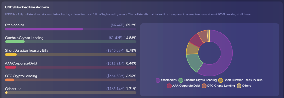 虽然USDS迈出了资产多元化的步伐,但储备中稳定币(USDC)的占比近六成,远高于超额抵押的部分(20%)。