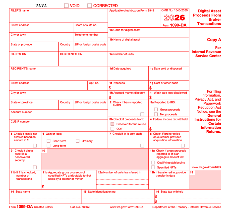 1099-DA表格结构对标传统证券的1099-B,但针对加密特性增加了多个细化框格: