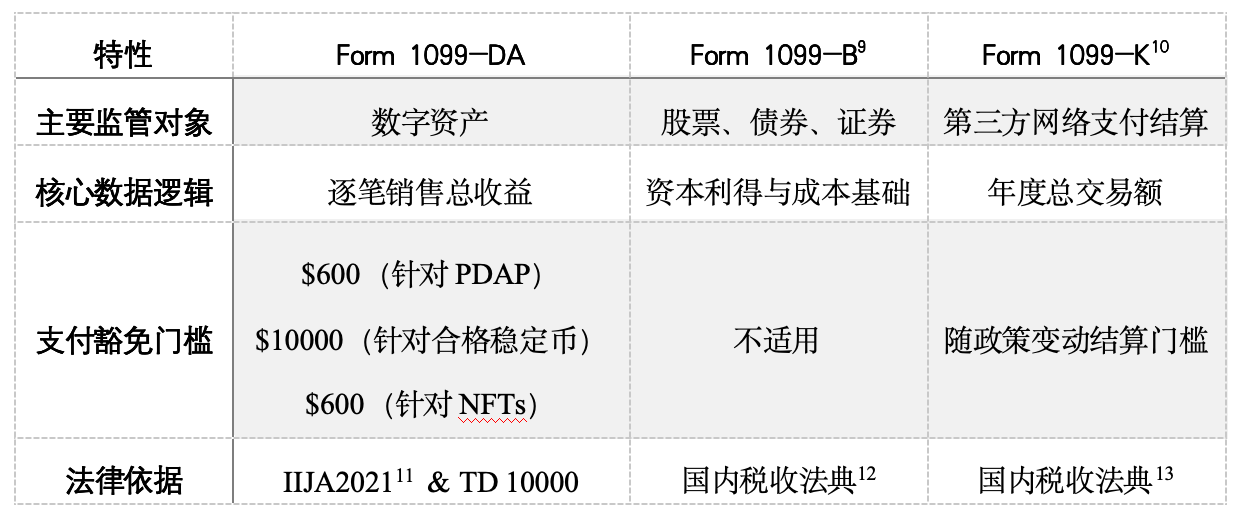 为直观地理解1099-DA的独特性,下表将其与传统金融及支付领域的申报表进行对比。