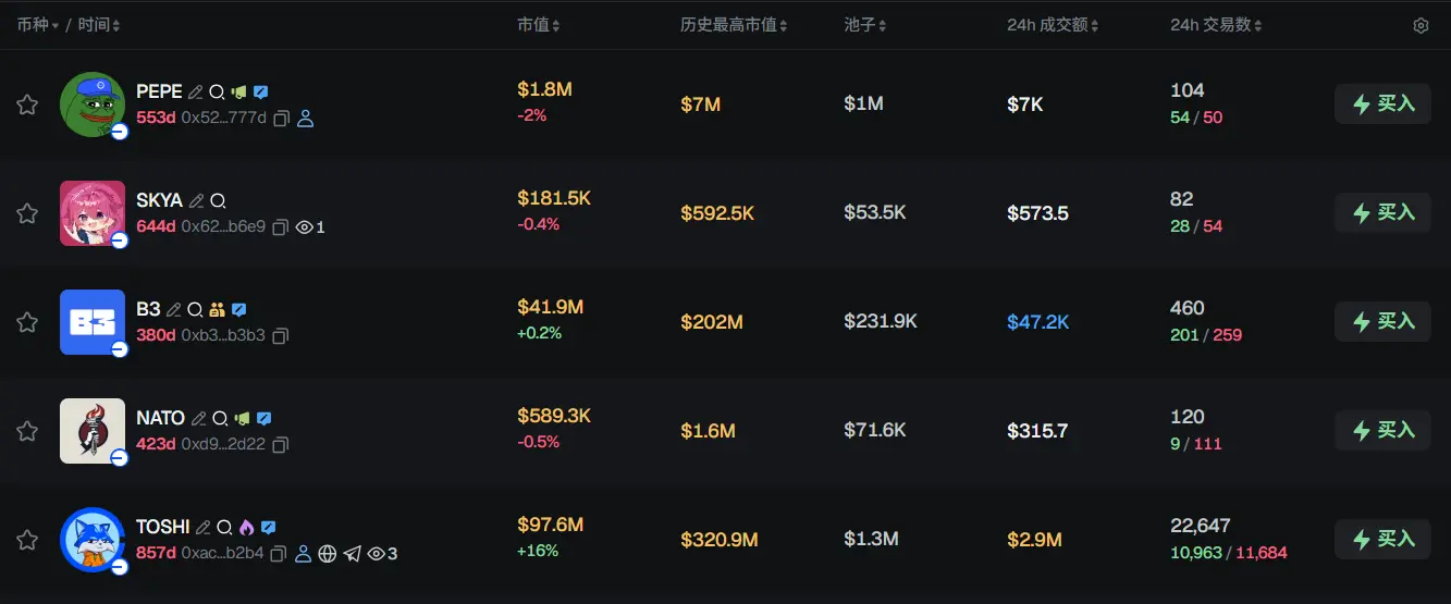 过去 24h Base 热门代币前五依次为:PEPE、SKYA、B3、NATO、TOSHI