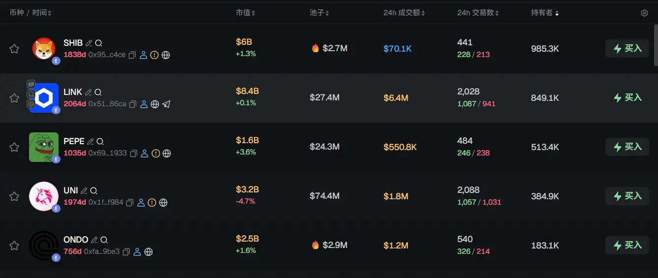 过去 24h ETH 热门代币前五依次为:SHIB、LINK、PEPE、UNI、ONDO