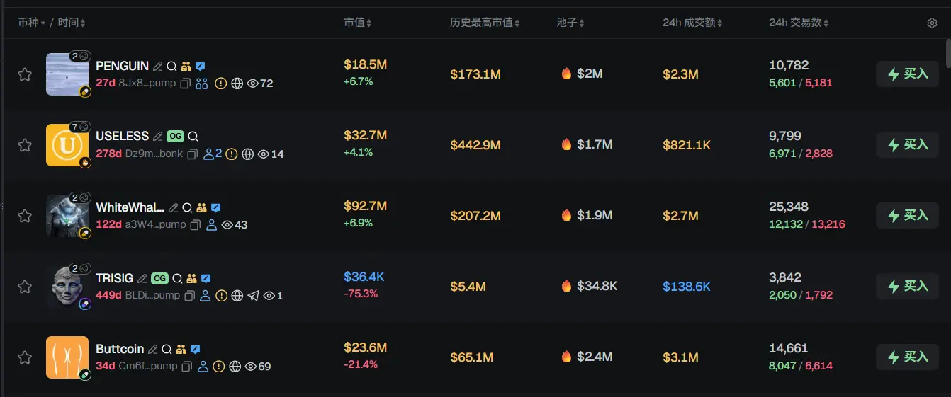 过去 24h Solana 热门代币前五依次为:PENGUIN、USELESS、WhiteWhale、TRISIG、Buttcoin