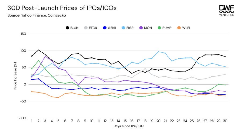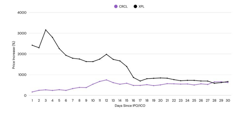 CRCL和XPL是例外,它们从一开始就经历了巨大的涨幅,为投资者提供了10-25倍的回报。尽管如此,它们的表现仍遵循上述趋势。其中, XPL在两周内自高点回撤65%,而CRCL则在此期间则稳步攀升。