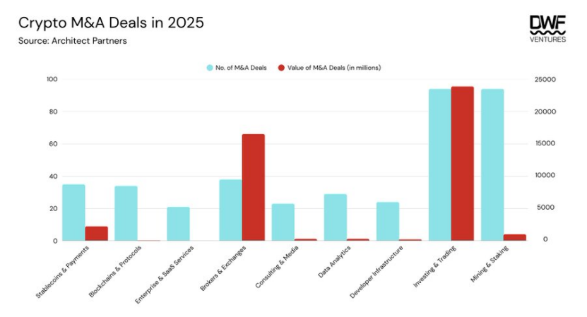 据报告显示,加密并购活动在2025年达到5年高点,这是由传统金融(TradFi)企业的发力以及更友好的监管情绪共同驱动。在特朗普政府出台一系列加密友好政策后,数字资产财库(DATs)迎来热潮,因为在资产负债表上持有数字资产敞口不再那么具有争议性。公司也将重心转向了收购,因为这是获取特定牌照来实现合规的更高效方式。总体而言,规范框架的建立为并购加速铺平了道路。