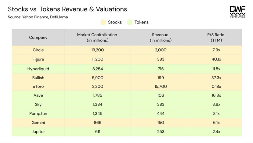 进一步分析收入数据可知,股票往往比代币具有更高的溢价,区间分别为7-40倍和2-16倍。这可归因于多种因素带来的流动性增强: