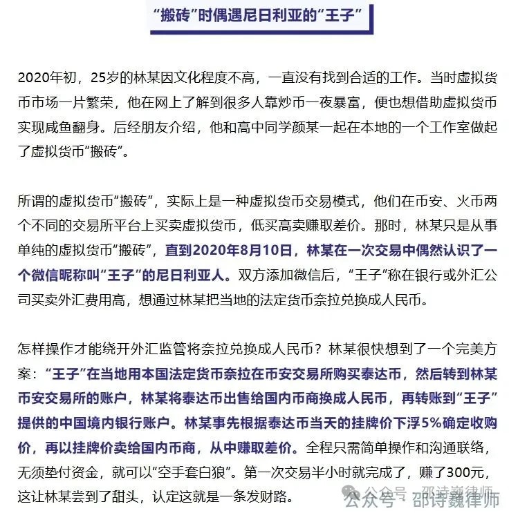 从 资金流向 上来看,林某参与了王子将尼日利亚当地法定货币奈拉,利用虚拟货币为媒介,兑换为人民币的全过程;