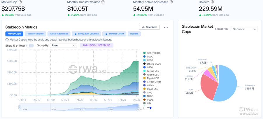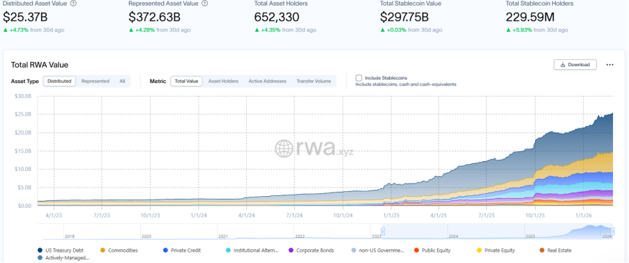 RWA.xyz 最新数据披露,截至2026年2月27日,RWA 链上总市值达253.7亿美元,环比上月同期上升4.73%,增速大幅放缓;资产持有者总数至约65.23万,环比上月同期增加4.35%,与资产规模增速基本持平,用户基础稳步拓宽。
