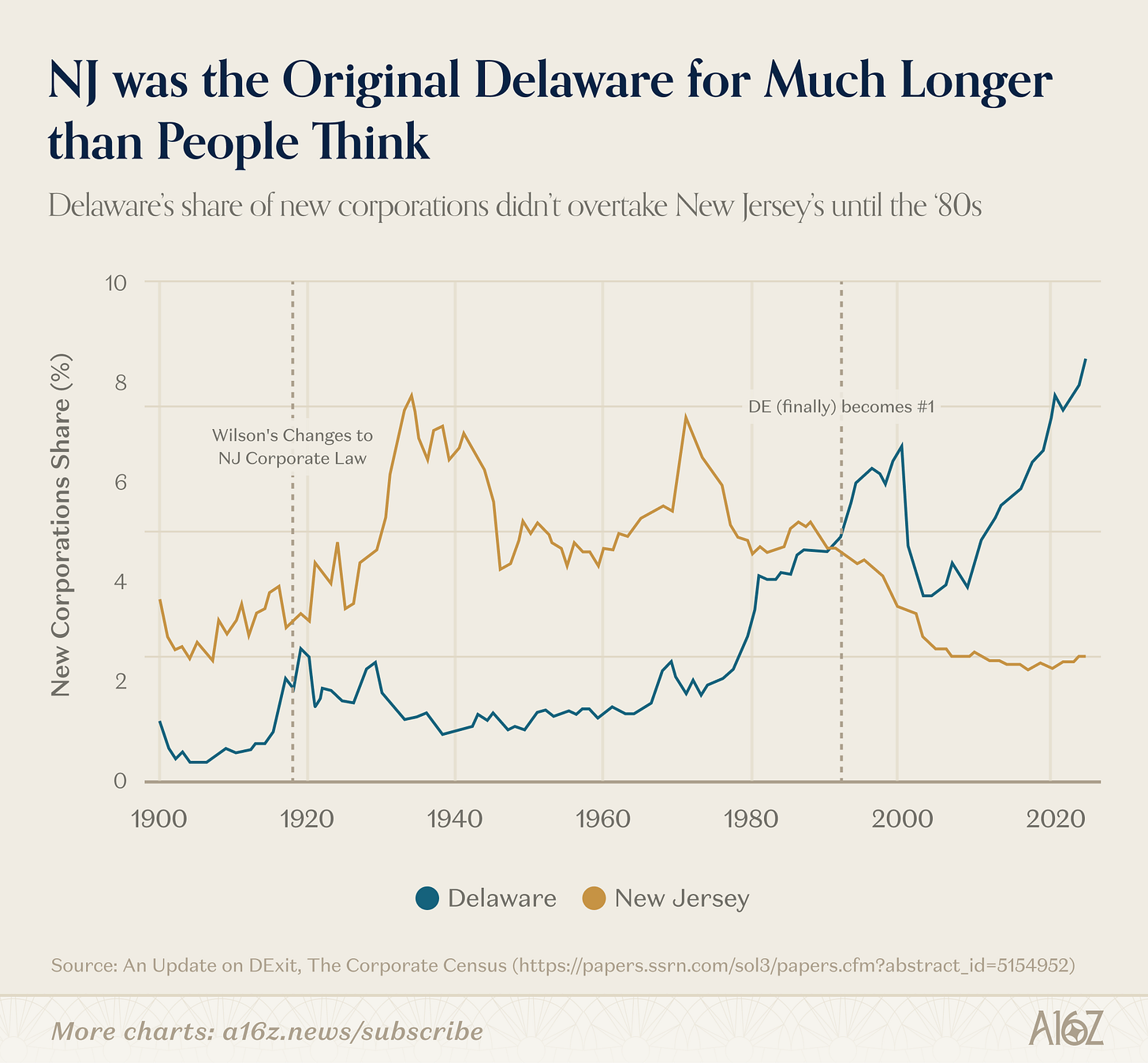 大约一个世纪前,特拉华州取代新泽西州——原来的"信托之母"——成为企业注册的首选地。新泽西之所以失去优势,是因为当时的州长伍德罗·威尔逊试图遏制"企业滥权行为",让新泽西的营商环境大为恶化。特拉华州的公司法本就仿照威尔逊时代之前的新泽西法律建立,自然乐于欢迎出走的企业,此后联合特拉华衡平法院,花了近100年时间建立起作为解决企业与投资者争端的成熟公正场所的声誉。