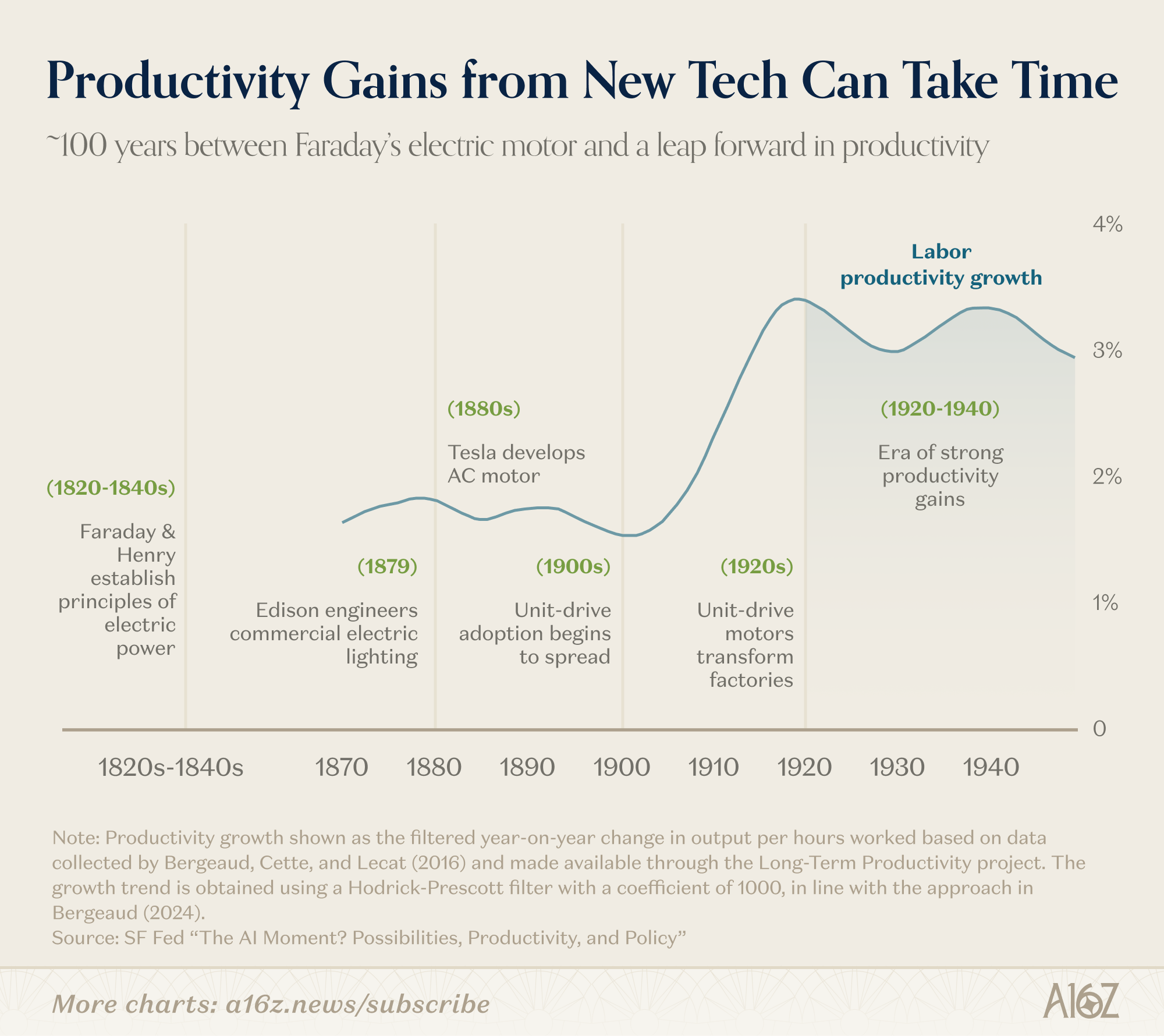 这个比较不是完美的类比,但如果历史能提供参照,我们可能还需要一段时间,才能真正看清"AI驱动型"经济究竟是什么样子: