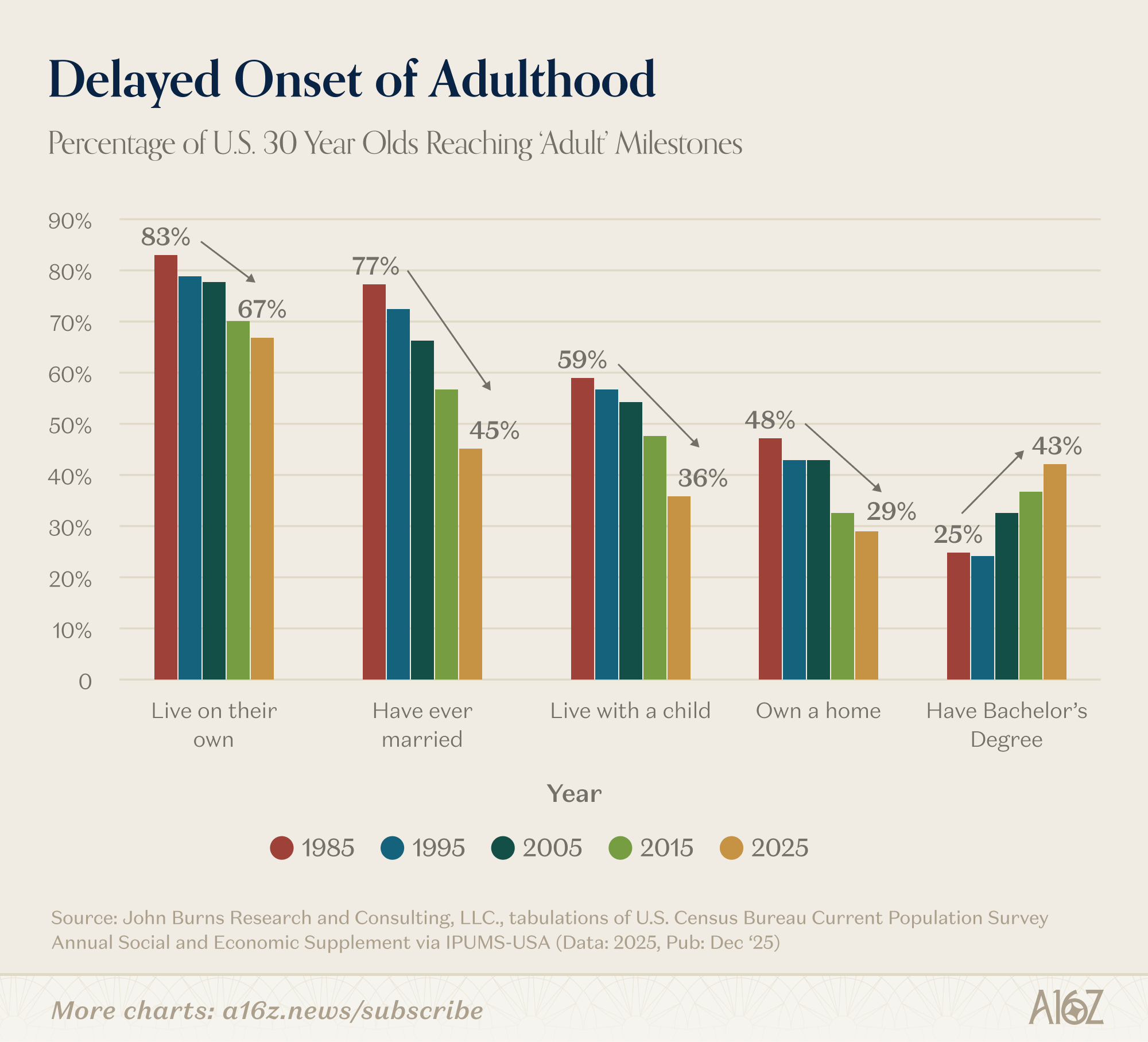 a16z图说趋势:今年AI成本降一半用量翻倍,美国30岁人群人生里程碑全面延迟