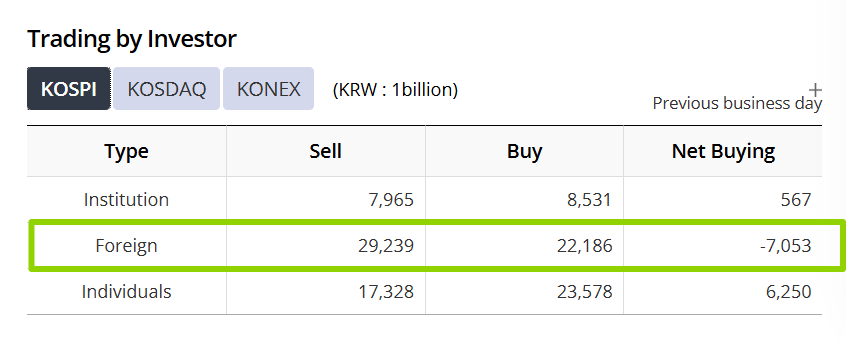 2 月 27 日,韩国市场外资净卖出 6.8 万亿韩元,刷新单日纪录。3 月 3 日又卖了 5.1 万亿。两天合计将近 12 万亿韩元,折合 85 亿美元,6 周流入量的一半,不到两天就没了。