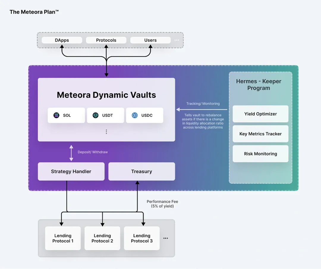 DAMM v1 是 Meteora 推出的首个 AMM,LP 可在其中获得交易费并额外赚取借贷收益。在 DAMM v1 中,用户存入的资产会自动投放到后台的动态金库(Dynamic Vaults)并配置到借贷协议中,获得额外的利息和奖励。