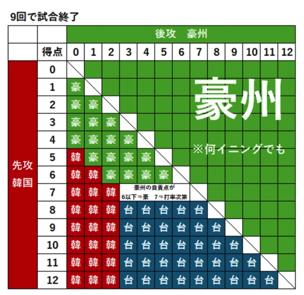 但無論如何,這都取得於韓國必須有辦法在澳洲投手身上打到八分以上,以上劇本才有可能實現,澳洲仍有可能本場輸球,但守下韓國不超過八分而晉級,目前韓澳兩方的牛棚狀態都在前三場燃燒殆盡,最後仍要看兩隊的實際調整狀況。