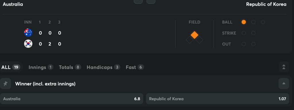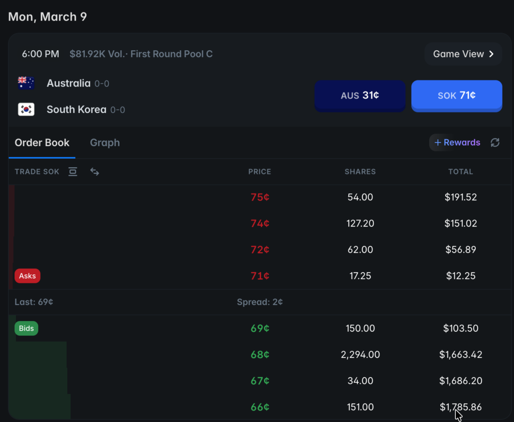 W BC 經典賽 C 組預賽進入最後一場——韓國 vs 澳洲,今日(3 月 9 日)傍晚 6 點在東京巨蛋開打。鏈上預測市場 Polymarket 開出的盤口為韓國 73 美分(73% 勝率)、澳洲 28 美分(28%),成交量 8.19 萬美元,Spread 僅 1 美分,流動性充足。區塊鏈平台B.C Game也顯示,韓國對澳洲賠率為6.8:1.07,韓國隱含勝率為86.4%。
