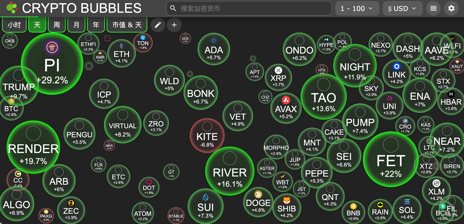 今日市值前100币种最大涨幅:Pi Network涨29.7%、ASI Alliance涨22.6%、Render涨20.1%、River涨17.3%、Bittensor涨14%。