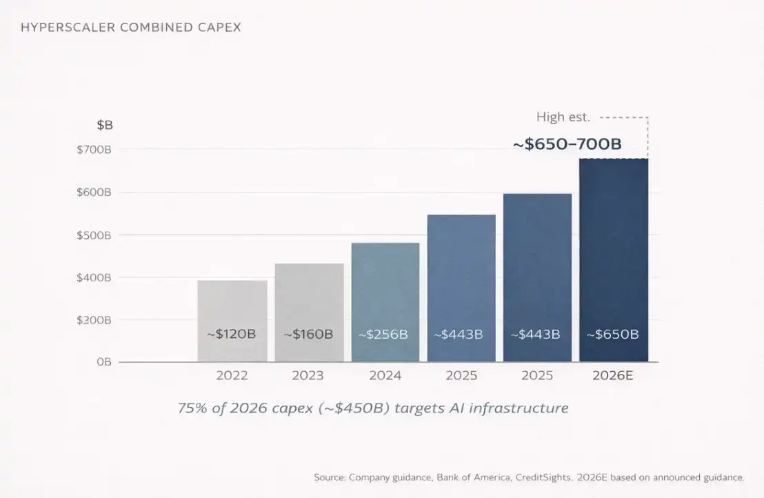 但大多数人忽略了一件事。到 2026 年,全球四大云计算公司(Amazon、Microsoft、Google、Meta)预计一年内的资本开支(CapEx)总额将达到 6500 亿到 7000 亿美元。