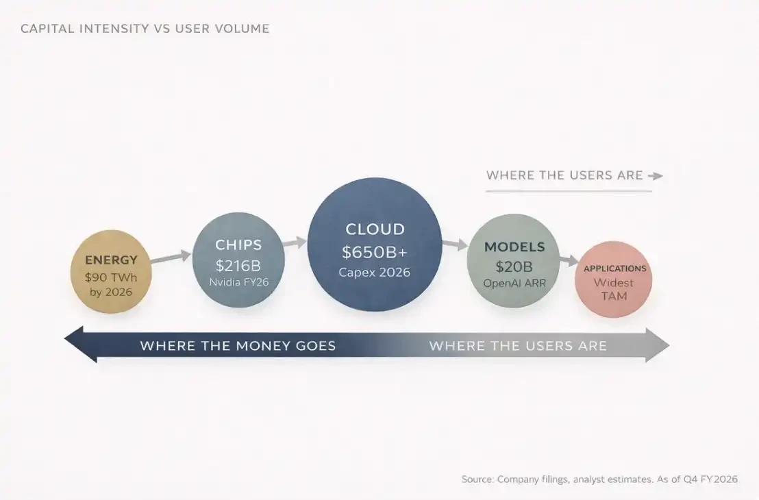 这就是 AI 价值链的第一条规律:收入向上流动,资本向下沉淀。