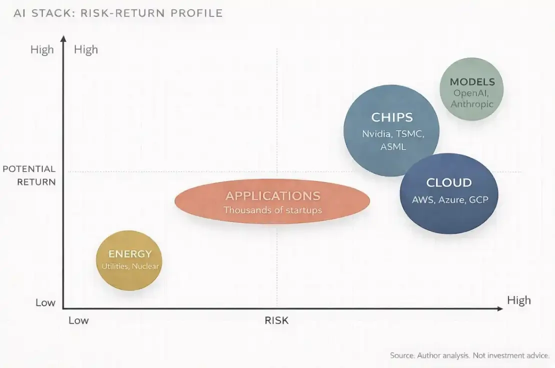 AI 价值链其实是五笔不同的交易。风险不同、时间周期不同、胜出者不同。把AI 当成一个行业,就像 1998 年把「科技」当成一个行业一样。内部差异巨大。