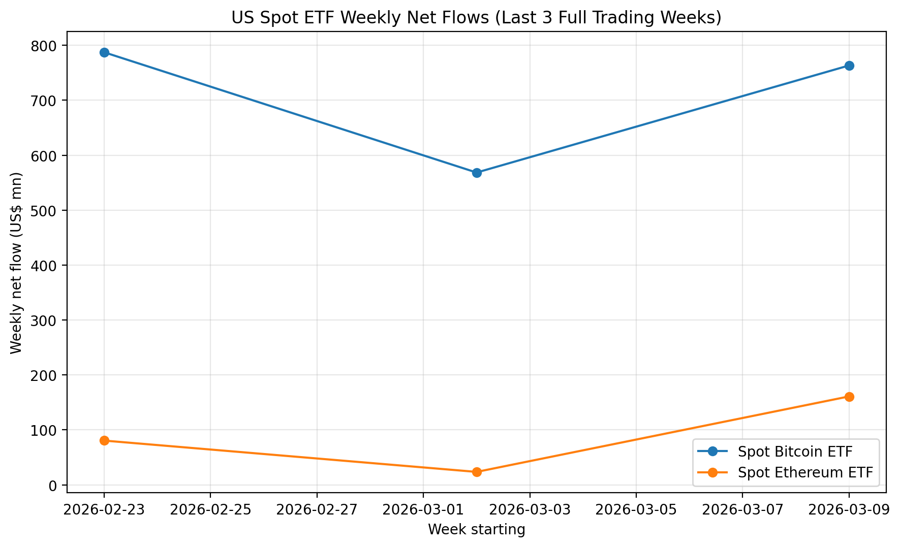 并且,比特币现货 ETF 在上周交易日(美东时间 3 月 9 日至 3 月 13 日)录得 2026 年来首次连续五天资金流入,流入资金总额为 7.67 亿美元。上一次出现类似的连涨行情是在 2025 年 11 月下旬,当时现货比特币 ETF 从 11 月 25 日至 12 月 2 日连续五天实现净流入,总共流入 2.8461 亿美元。