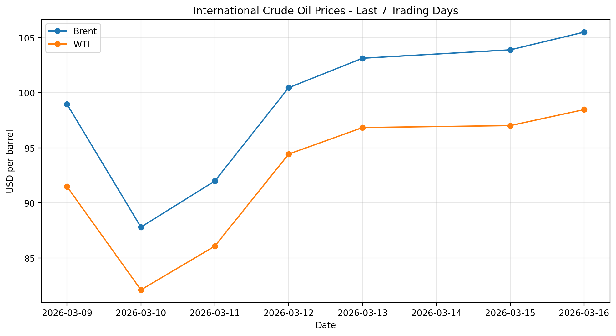 布伦特原油与 WTI 原油过去一周价格走势